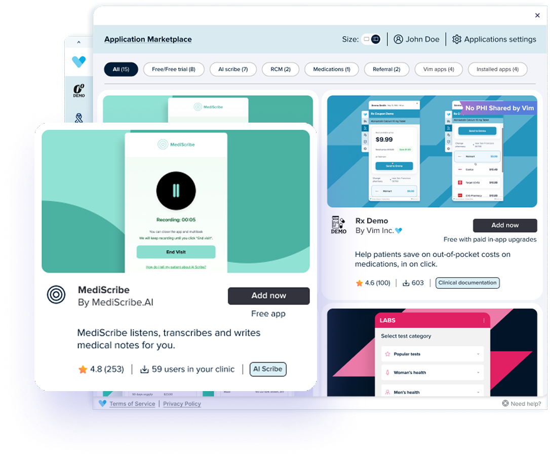 Vim connects healthcare’s key players—providers, payers, EHRs, and developers—through a powerful, in-workflow platform. We deliver the right data, tools, and actions at the point of care to streamline operations, improve outcomes, and unlock innovation.
