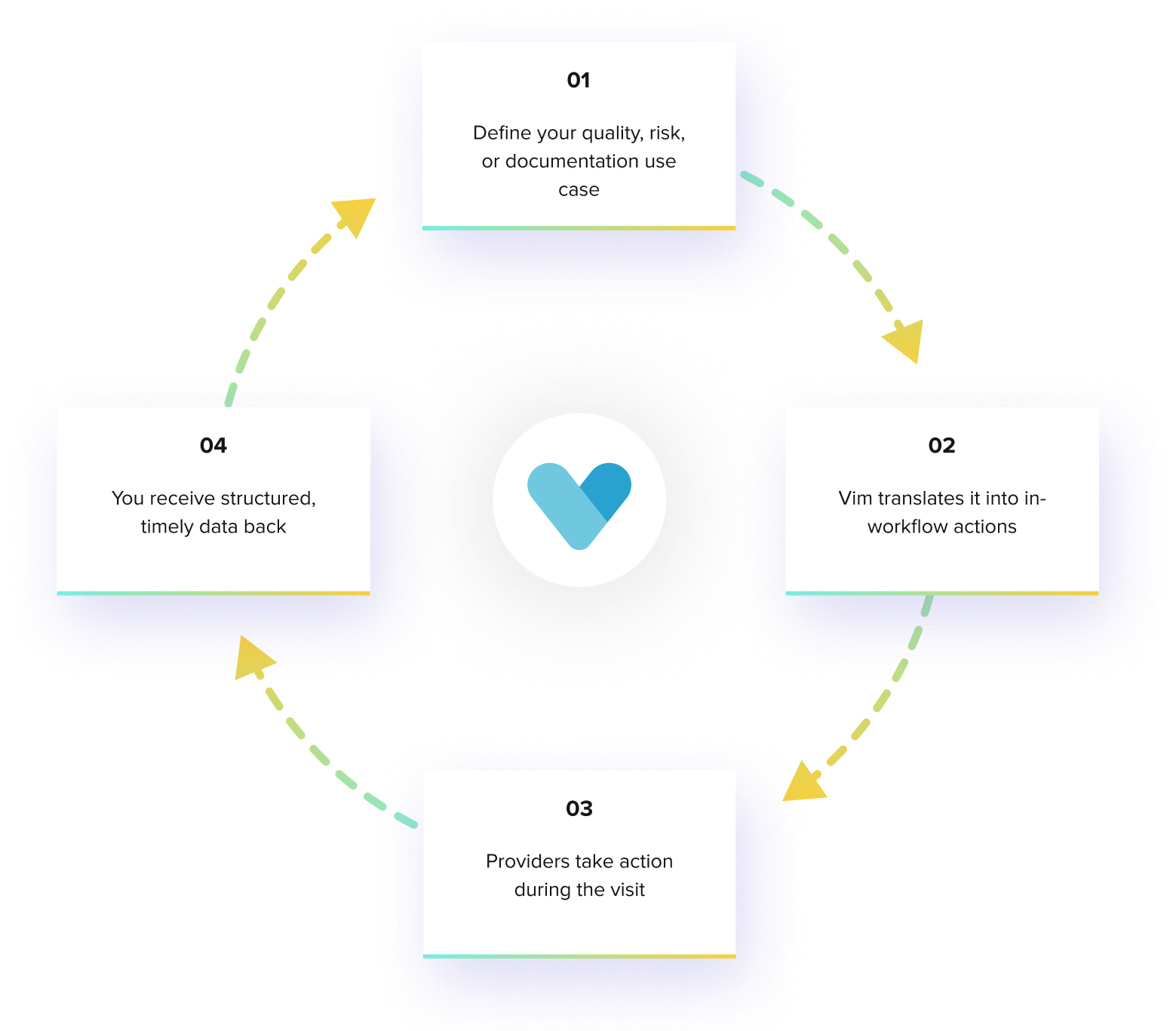 Vim delivers your data and tools directly into EHR workflows. That means higher engagement, better data quality, and faster alignment to value-based care, without forcing providers to change how they work.